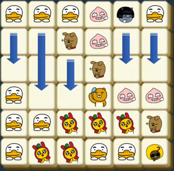 같은 모양의 카카오프렌즈 블록이 2×2 형태로 4개가 붙어있을 경우 사라지면서 점수를 얻는 게임이다.